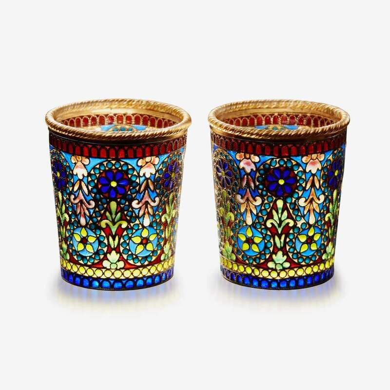 A pair of Russian silver-gilt plique-à-jour enamel vodka cups Pavel Ovchinnikov, Moscow, 1908-1918