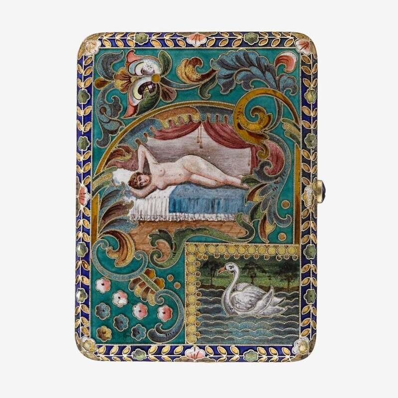 Of typical form, allover decorated in scrolling foliate motifs in shaded enamel, both sides with a swan swimming lower right, the front enameled en plein with a voluptueuse en couchant.