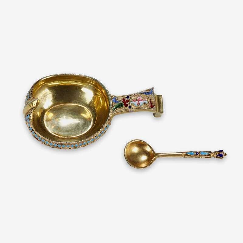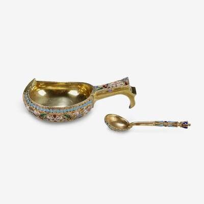 A silver-gilt and shaded enamel kovsh-form salt with matching spoon Ivan Saltykov, Moscow, circa 1890
