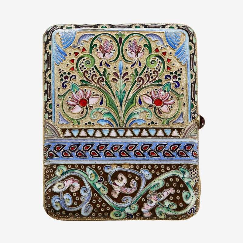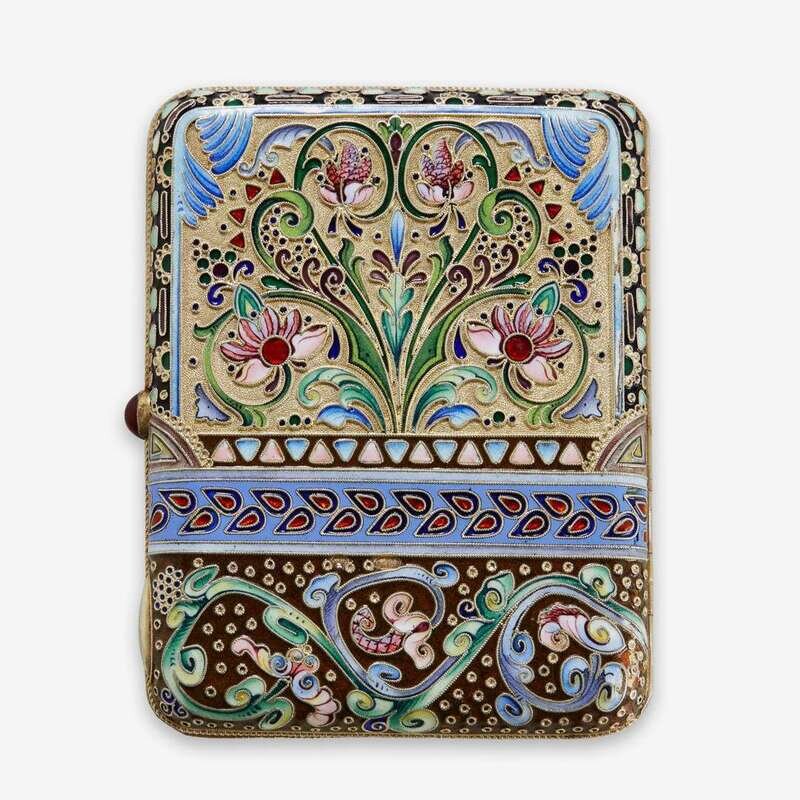 A Russian silver-gilt and shaded enamel cigarette case 11th Artel, Moscow, 1908-1918