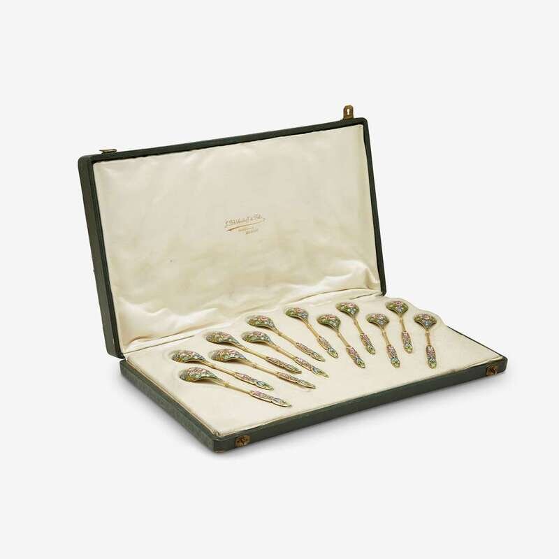 With backs and paddle-shaped handles decorated in scrolling foliate shaded enamel, together with original retailer's presentation box form Khlebnikov; the interior stamped in French "I. Khlebnikoff & Fils, Orfevres, Moscow", the exterior stamped with gilt monogram "S.H." (12).