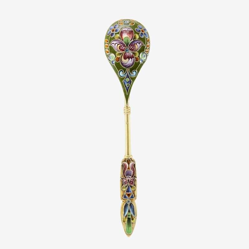 A set of twelve silver-gilt and shaded enamel demitasse spoons Feodor Ruckert, retailed by Kkhlebnikov, Moscow, 1908-1918