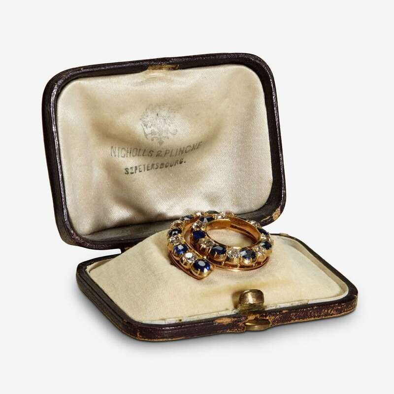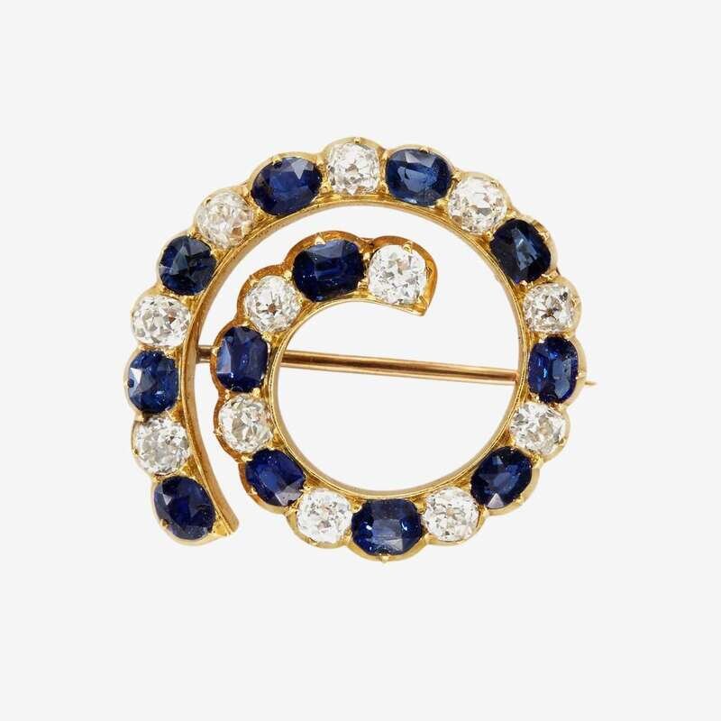 A sapphire and diamond-set gold spiral brooch in original box Nichols & Plinke, St. Petersburg, 1882-1889