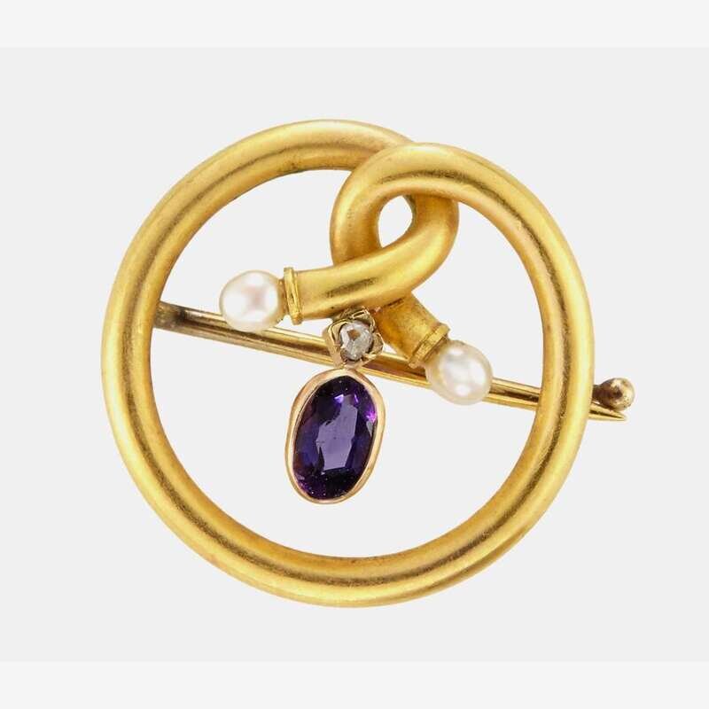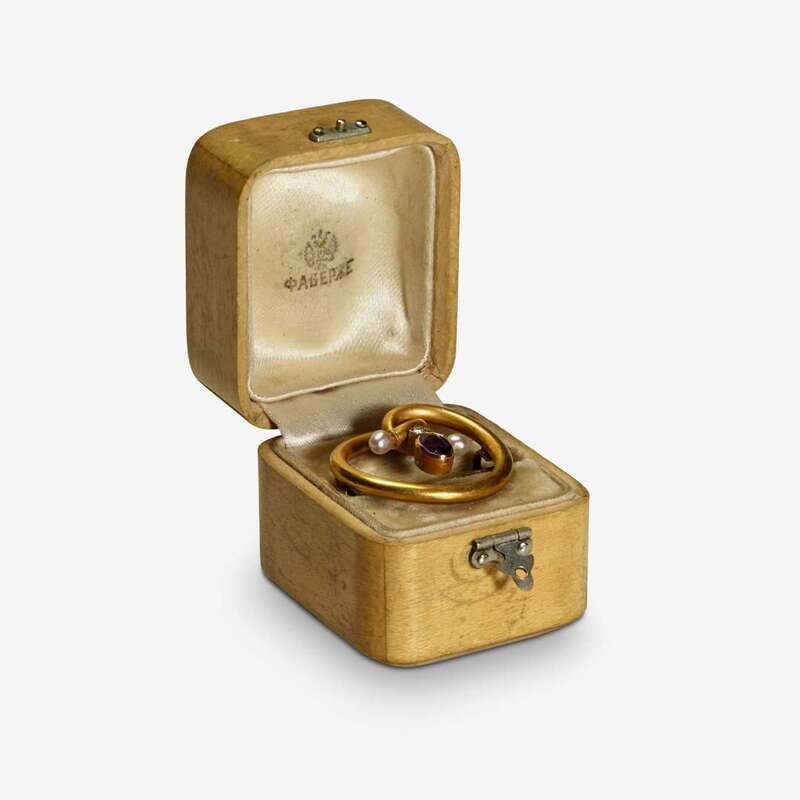 A Fabergé gold, amethyst, pearl, and diamond brooch in original box Fabergé, workmaster Alexander Tillander, St. Petersburg, 1899-1908