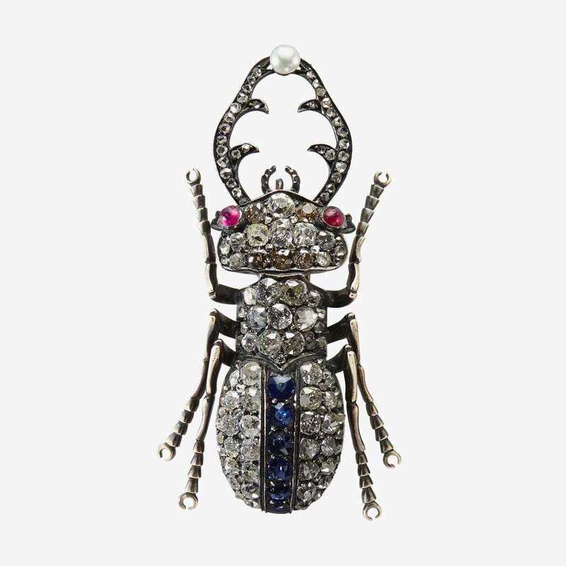 A Fabergé diamond, sapphire, ruby, and cultured pearl naturalistic beetle brooch Fabergé, workmaster August Holmstrom, St. Petersburg, circa 1880
