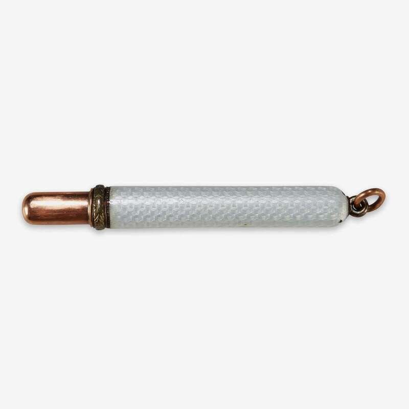 The rose gold handle with yellow gold leaf-tip banding, the body of the pencil allover enameled in white above an engine-turned ground; marks visible beneath for August Hollming, with left facing kokoshnik mark, and with rose gold suspension ring.