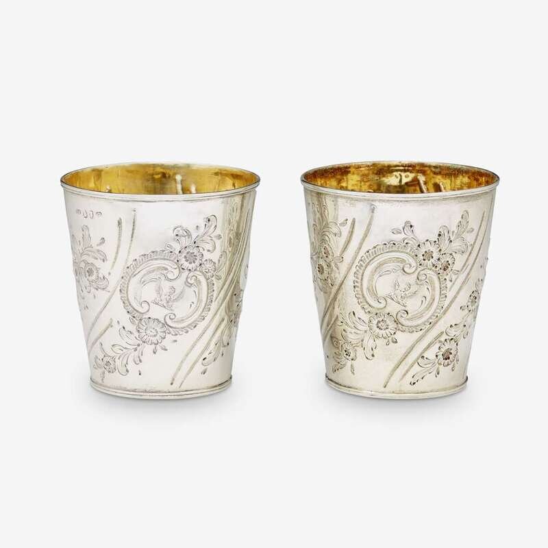 Cylindrical form with repoussé florals and scrolls, engraved with family crest within double C-scroll cartouche, with gilt-washed interiors. (2).
