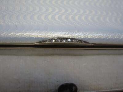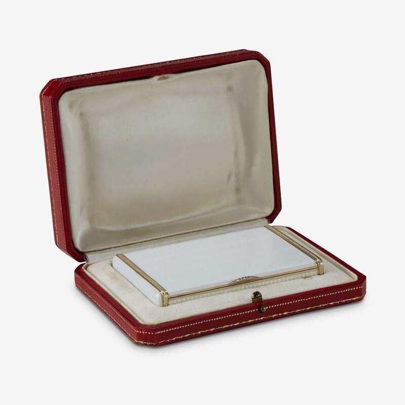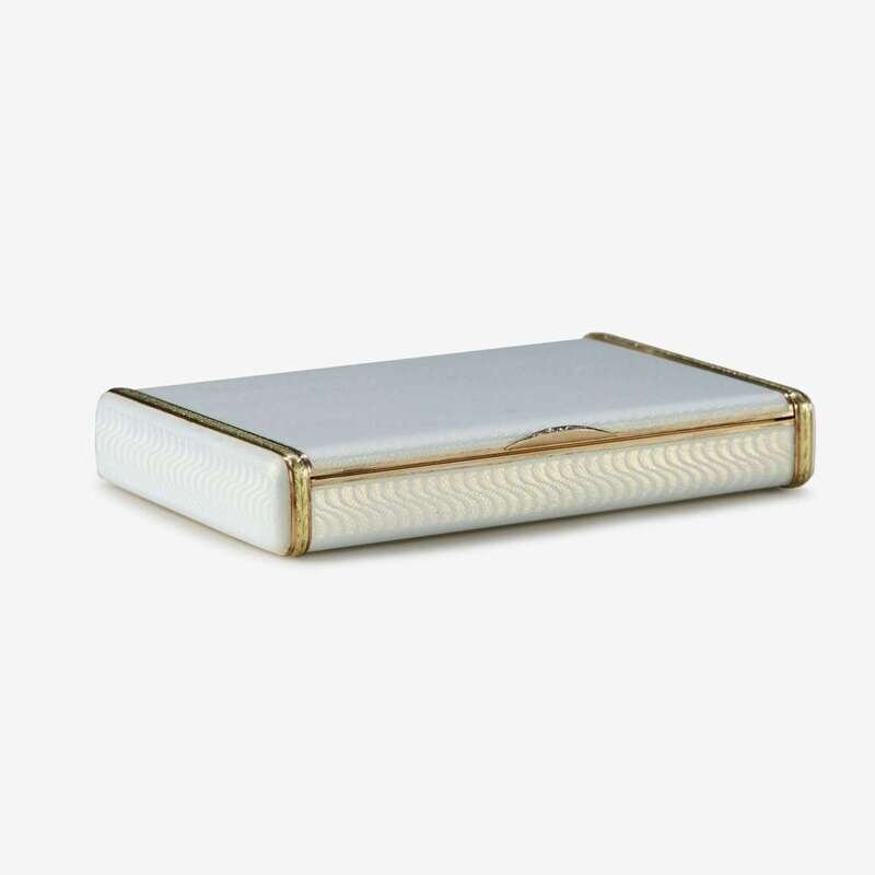Rectangular and overall enamelled in translucent opalescent oyster enamel above wave-turned guillochage, the ends banded with rose and green gold laurel moldings, the thumbpiece set with five rose-cut diamonds; later fitted with a mirror as a compact by Cartier, sold together with a fitted Cartier case.