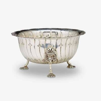 Circular with scalloped edge and fluted motif to body, raised on three grotesque mask-capped shell feet.