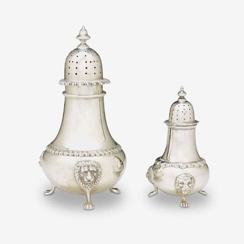 Of baluster form with gadrooned bands raised on three lion mask capped paw feet; together with a second caster of similar design, with date letter for 1975-76. (2).