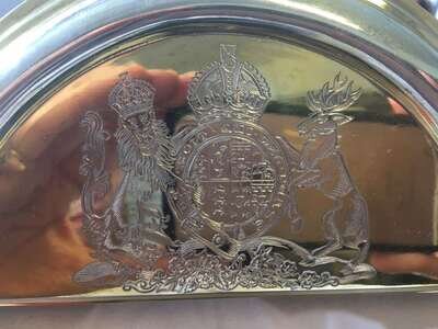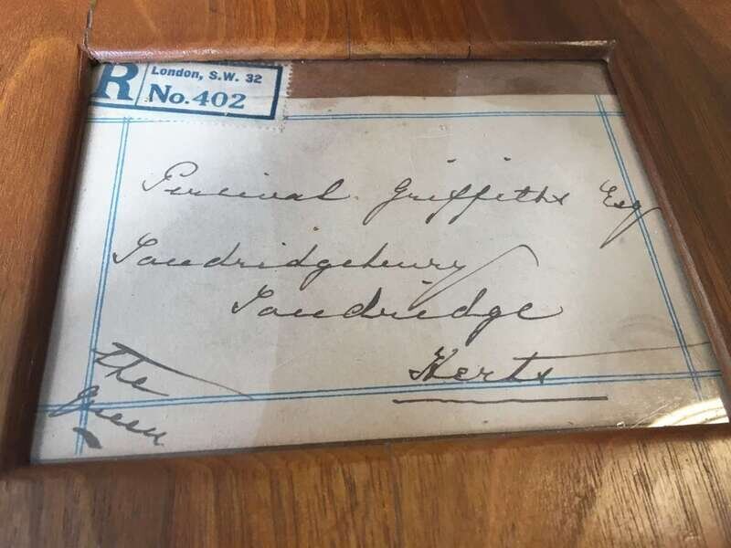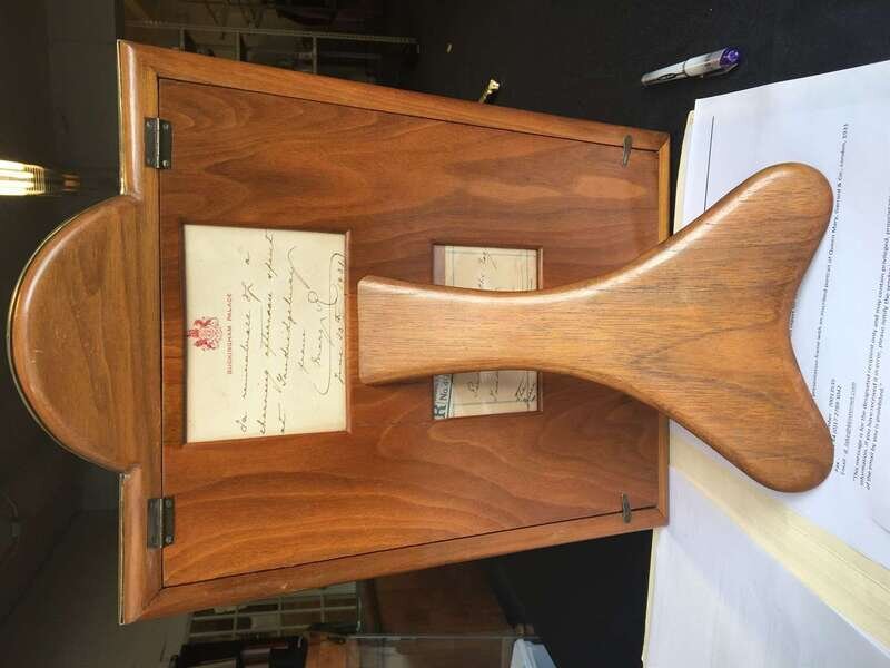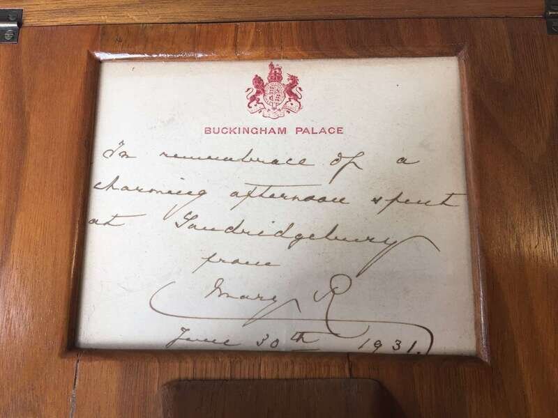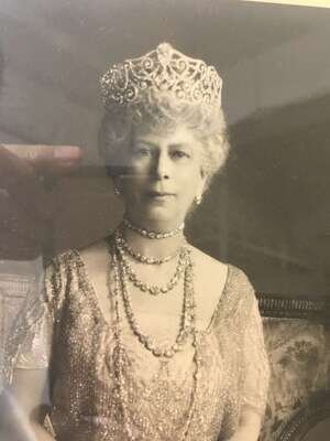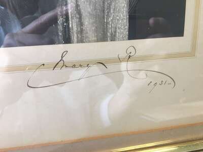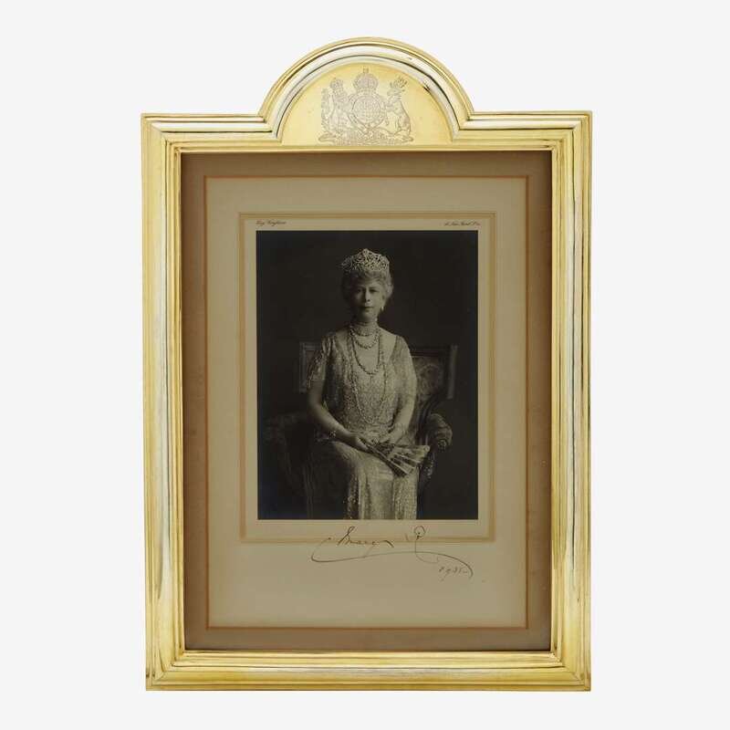 The frame surmounted by Queen Mary's Royal Coat of Arms, the official portrait of Queen Mary by Hay Wrightson and inscribed "Mary R" and dated 1931; the verso mounted with handwritten note on Buckingham Palace embossed letterhead and hand-addressed envelope.