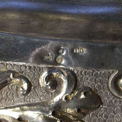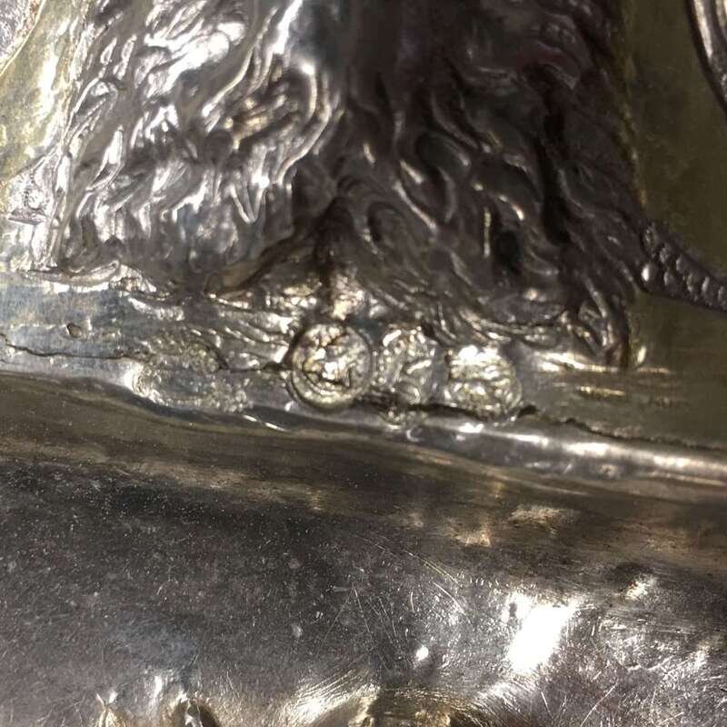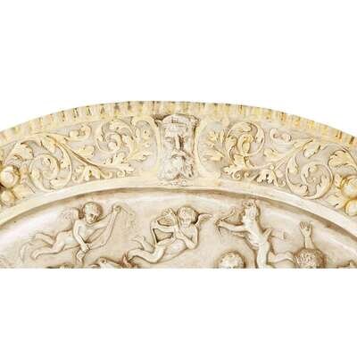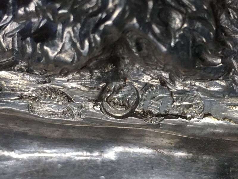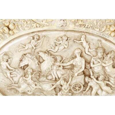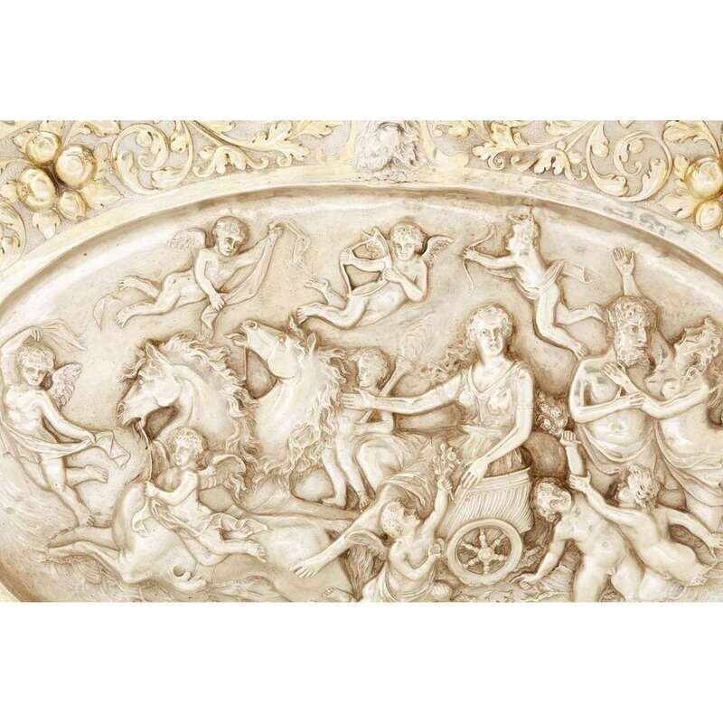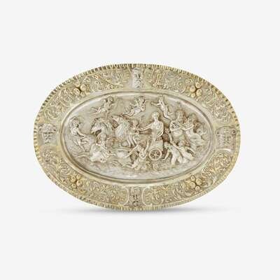 The oval platter with a banded scrolling foliate repoussé border decorated with masques, and centering a depiction of the Triumph of Amphitrite, queen of the Sea and consort of Poseidon. With indistinct marks for Middleburg and other marks, as well as Soviet export marks from the early 20th century.