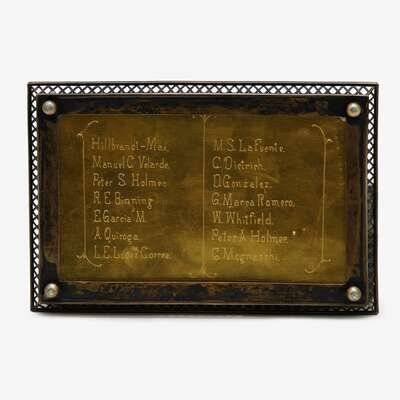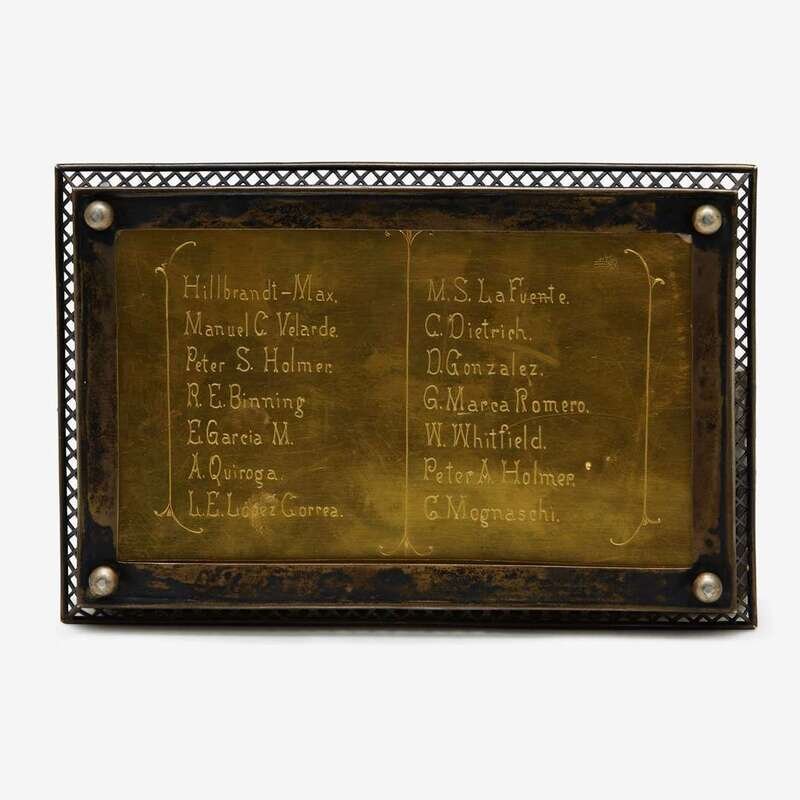 Rectangular, engraved with Spanish inscription to one side and names to the other; mounted in a silver-gilt tray.