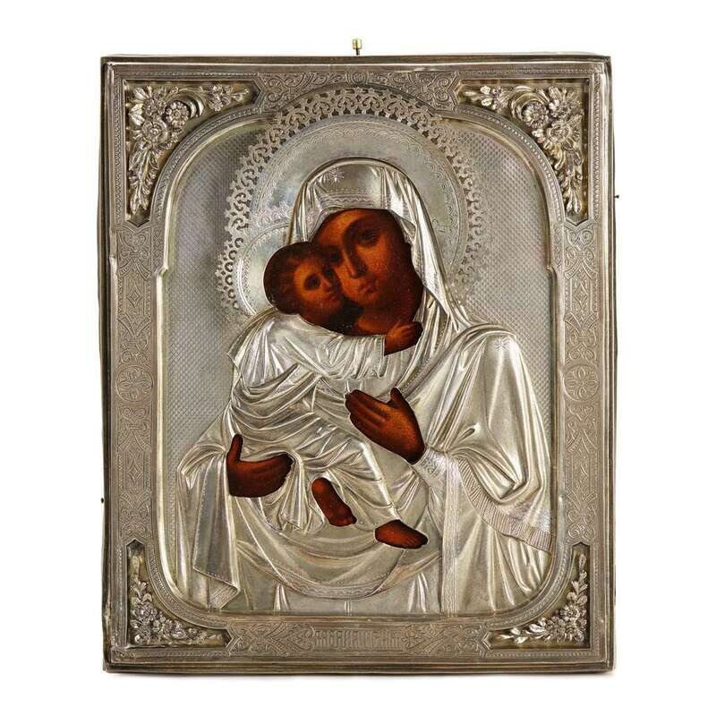 A Russian icon of the Iverskaya Mother of God with silver oklad Anton Mikhailovich Chevarzin, Moscow, 1891