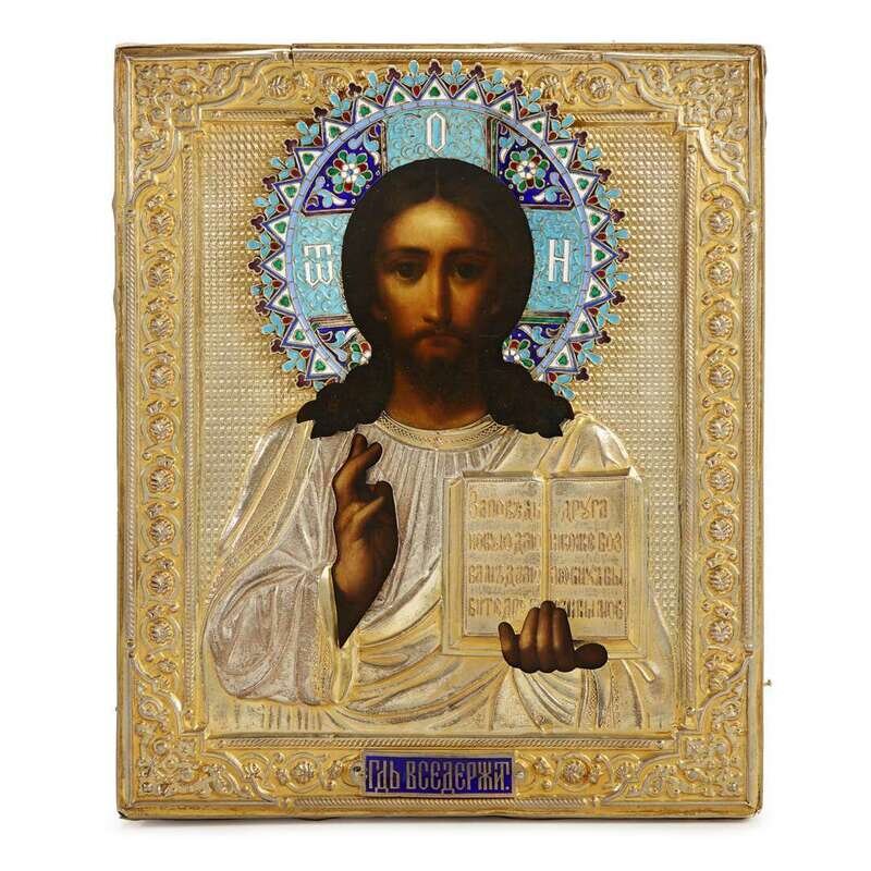 A Russian icon of Christ Pantocrator with silver-gilt and cloisonné enamel oklad unknown maker SG, Moscow, 1878