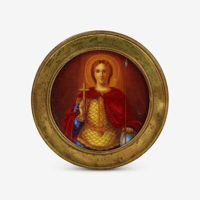 A Russian giltmetal mounted porcelain icon of St. Dmitrii Solunskii Russian Imperial Porcelain Factory, marks effaced, circa 1850