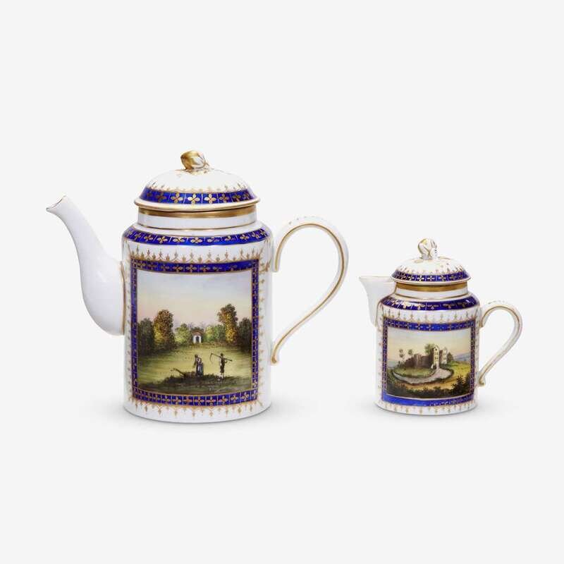 Comprising a tea pot and covered creamer decorated with landscapes in cobalt and gilt framing with rosebud finials, with blue underglaze marks for period of Catherine II Alexeievna "The Great," 1762-1796.