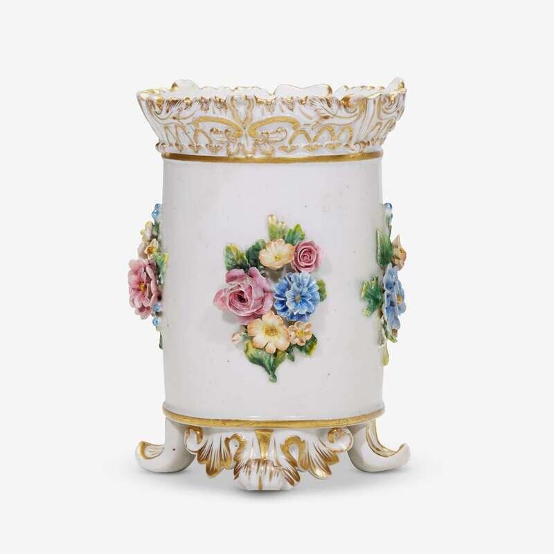 Of columnar form with applied floral sprays on molded feet, with blue underglaze marks for the period of Nicholas I Alexandrovich, 1825-1855.