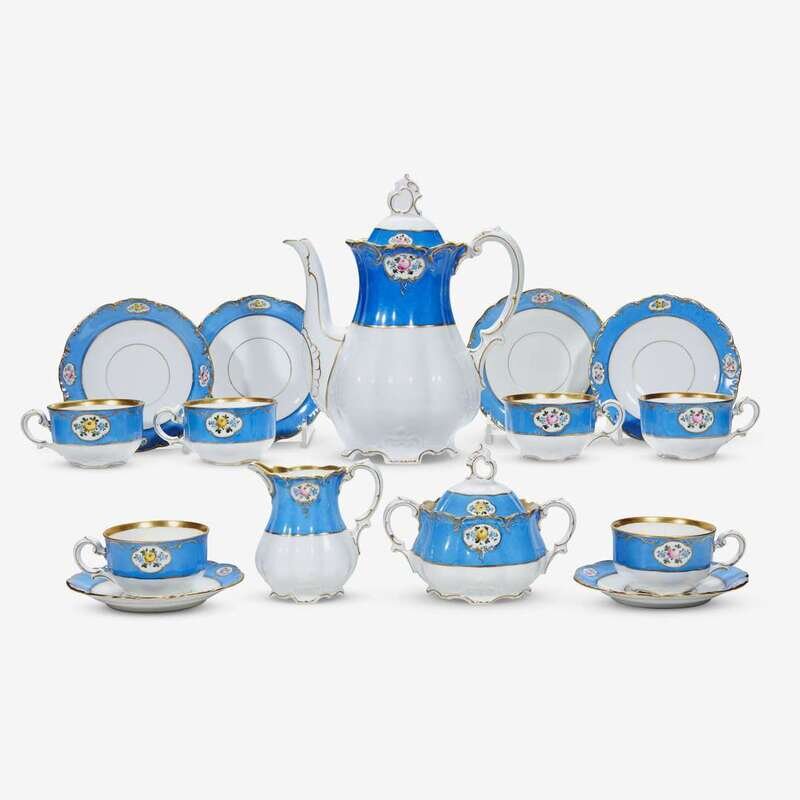 Comprising a coffee pot, creamer, sugar bowl, and six cups and saucers; with red overglaze marks for the Kornilov Brothers Factory, 1840-1861. (9).