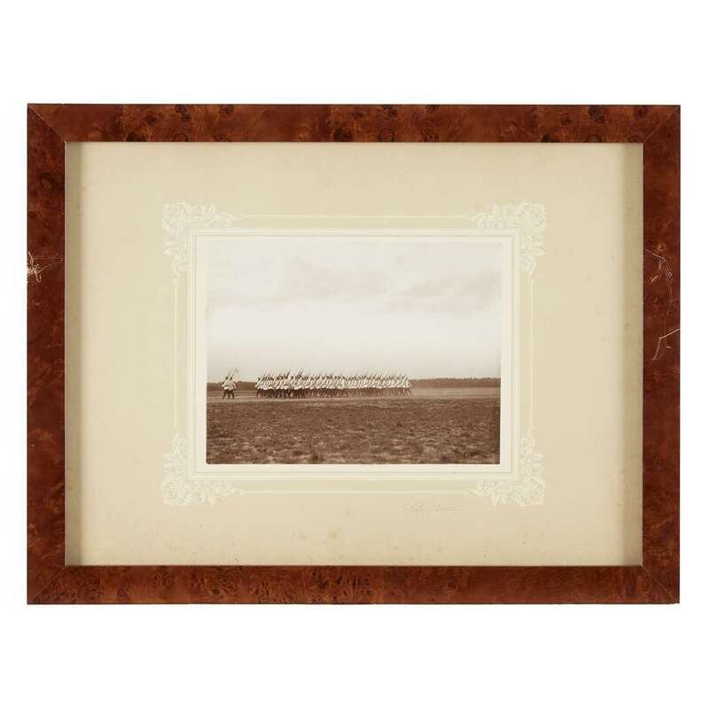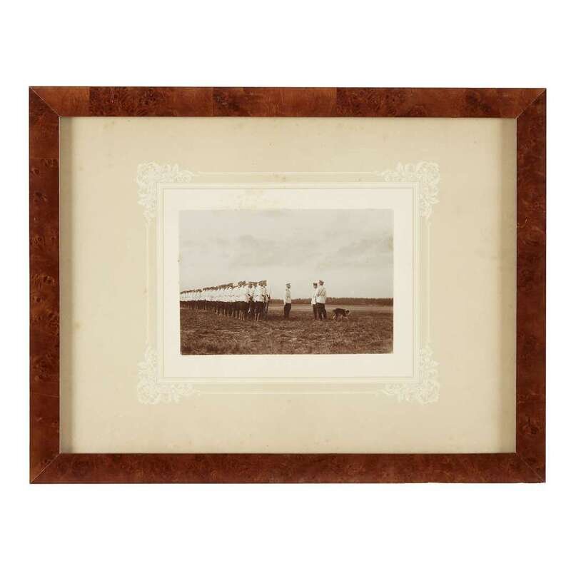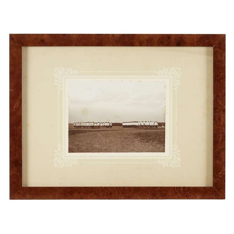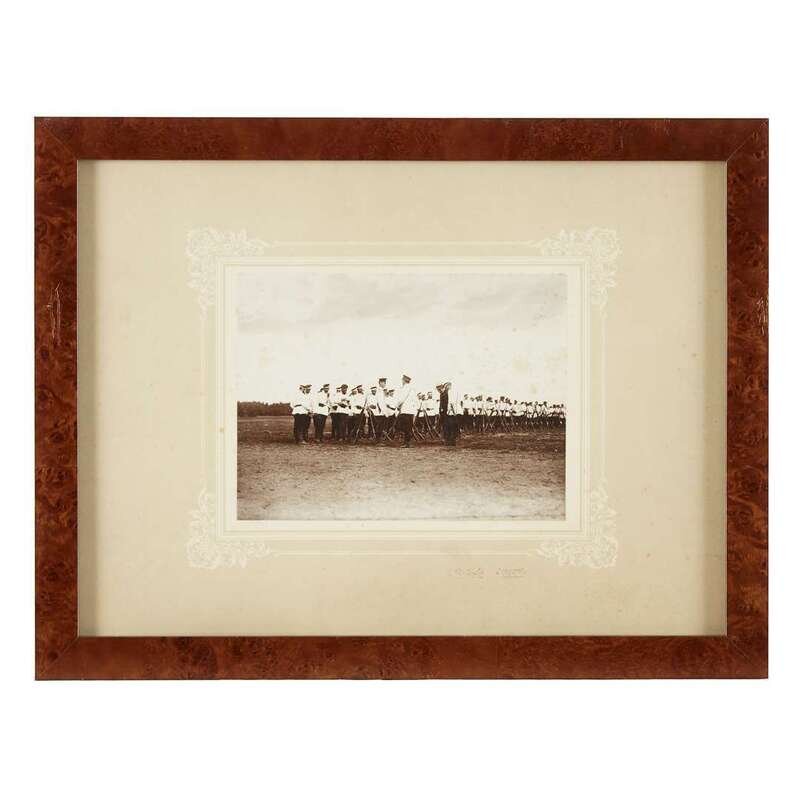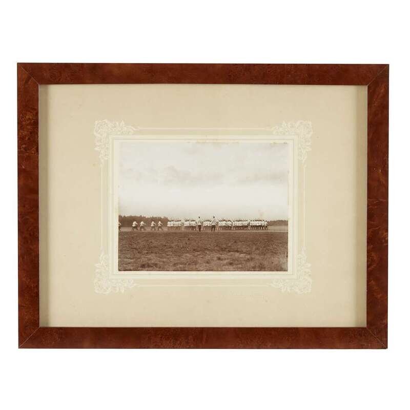 Thirteen photographs mounted on card and framed, depicting manoeuvres of the Imperial regiments at Krasnoe Selo and other locations, under the direction of Grand Duke Michael Alexandrovich (visible in several photographs), brother of Emperor Nicholas II Alexandrovich. (13).