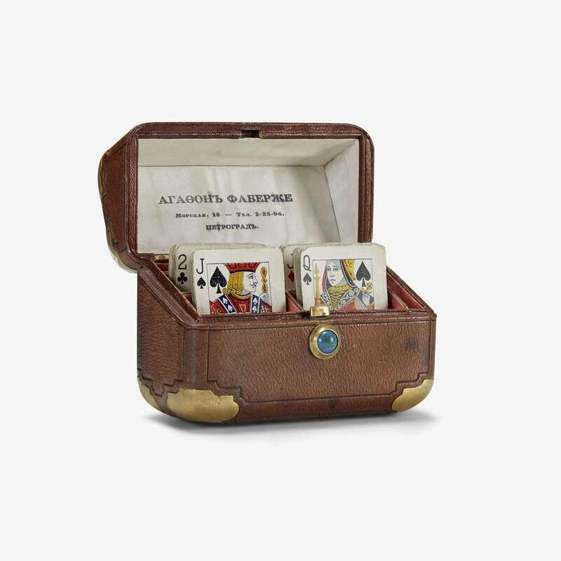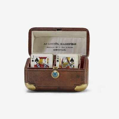 The rectangular leather box with gilt-metal mounted and enamel banded corners, the inside with later retailer's silk, reading "Agathon Fabergé" and containing playing cards.