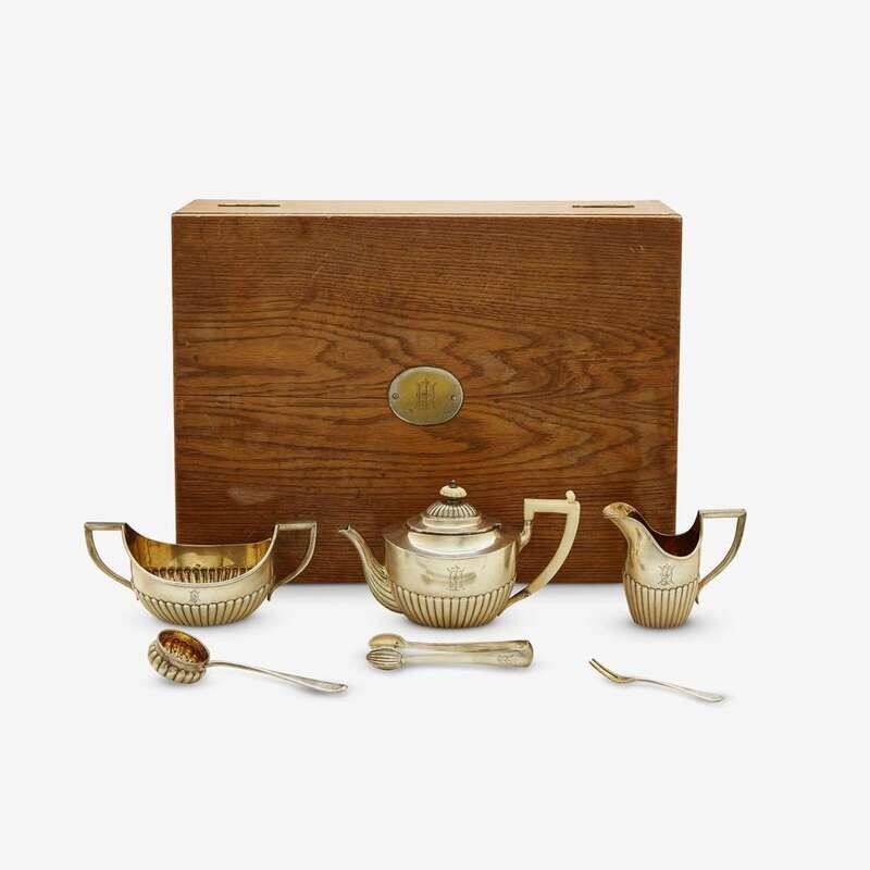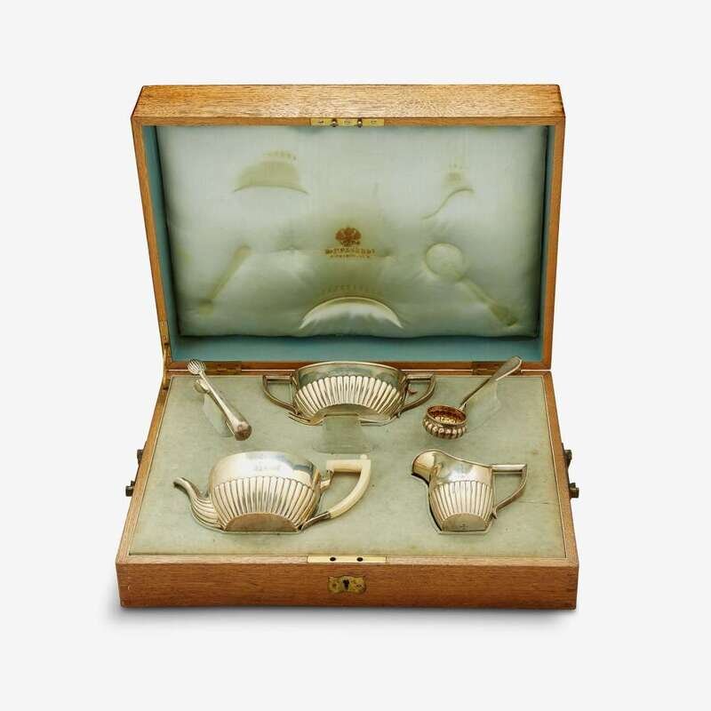 Comprising a teapot, creamer, sugar bowl, tea strainer, sugar tongs, and a lemon fork, the pieces each engraved with the monogram HJ; in original oak presentation case, the silk lining stamped in Russian "Grachev Brothers, St Petersburg" with imperial warrant, and each piece variously marked. (6).