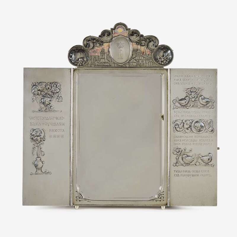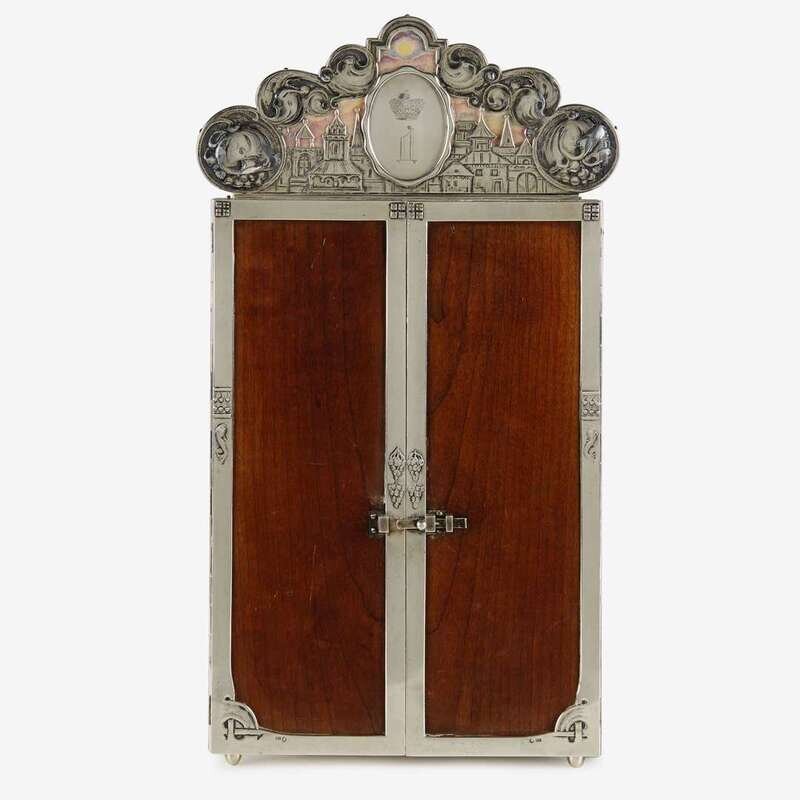 In the Russian "Stil' modern", the silver banded palisander doors with a silver bolt opening to reveal two interior panels modeled and chased with art nouveau motifs, and the lyrics to the folk song "Tell me, tell me, Sparrow," the crestrail with a stylized Kremlin skyline against a gouache sunset, centering a cartouche in the form of a wax seal engraved with the cypher of Grand Duke Dmitri Pavlovich of Russia (1891-1941) set between roiling stylized clouds, the back with shaped strut.