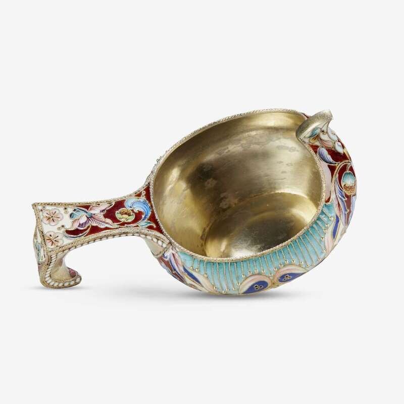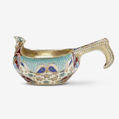 A Russian silver-gilt and shaded enamel kovsh Aleksei Nikolaevich Baranov, Moscow, 1908-1918