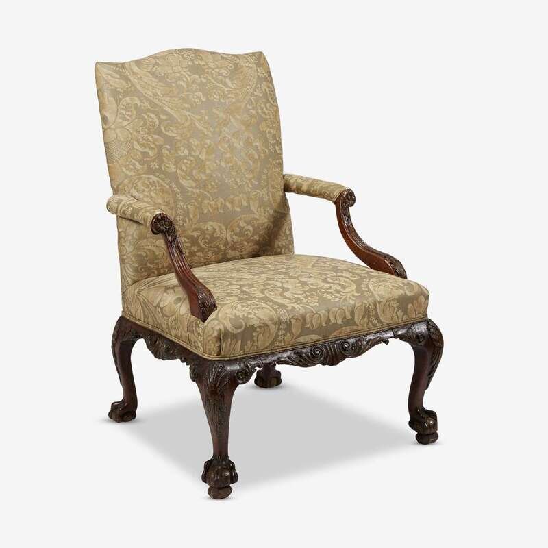 The shaped rectangular backrest issuing two straight manchettes supported by outscrolled flower- and foliate-carved arms, the upholstered seat over foliate-carved apron raised on four legs with shell-carved knees terminating in ball-and-claw feet.
