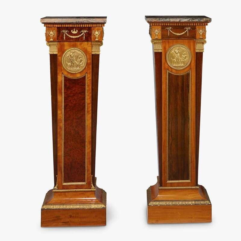 A near pair of George III style ormolu mounted mahogany and satinwood pedestals late 19th century, in the style of Benjamin Vulliamy