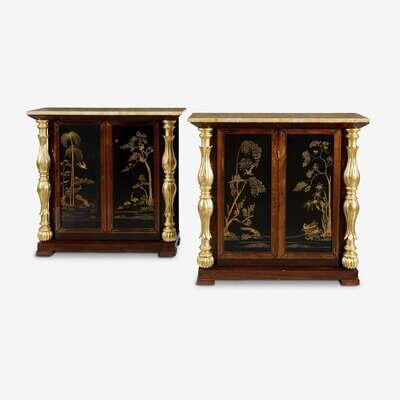 The rectangular marble top supported by two carved giltwood columns flanking a pair of Japanned cupboard doors enclosing two shelves, the sides similarly decorated; raised on bracket feet. (2).