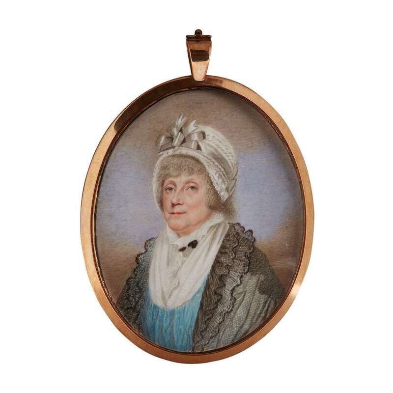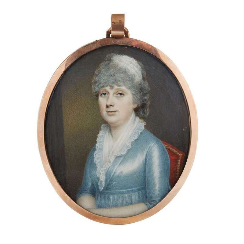 Oval portrait on ivory of a lady in silk dress and lace collar seated in an interior, signed and dated "Jukes 1798", in gilt metal frame, the reverse with blue glass and plaited hair border encircling a seed pearl anchor; together with an oval portrait on ivory of a lady in blue dress and black lace shawl and white lace cap, attributed to Moses Griffith. (2).