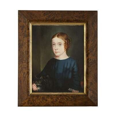 Each painted in matching blue dresses with lace collars and cuffs, the first depicted against a dark landscape with roses and the second in an interior setting holding a cat. (2).