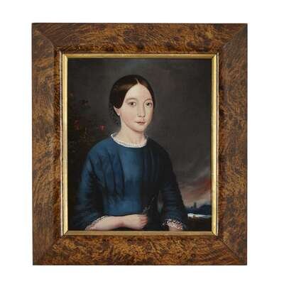 Two English Primitive School portraits of girls in faux-grain painted frames circa 1830