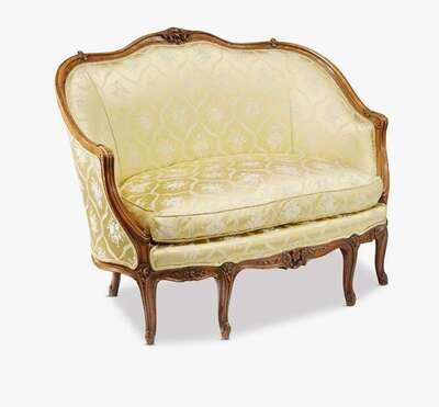 Upholstered in citron silk, the shaped crestrail carved with rocailles and flowers, the apron similarly carved, with six conforming feet. ***COMBINED WITH 3***.