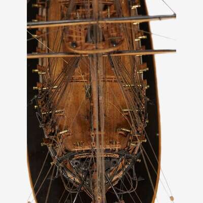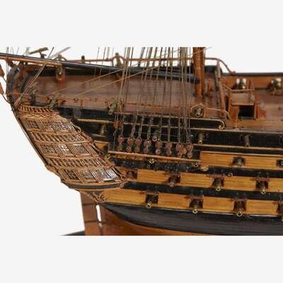 The three-masted ship with standing and running rigging, with carved Classical figurehead, bearing all elements of ships of this period, including pierced gunports and turned brass cannons, beakhead, bulwarks, deck gear and fittings, fife rails, ladders, stern lanterns, hatches, stairway, balustrades, windowed galleries, and other highly decorative details; sold together with a custom modern glass case.
