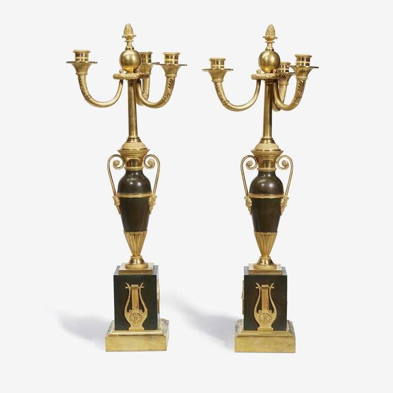 A pair of Empire ormolu and patinated bronze three-light candelabra first quarter 19th century