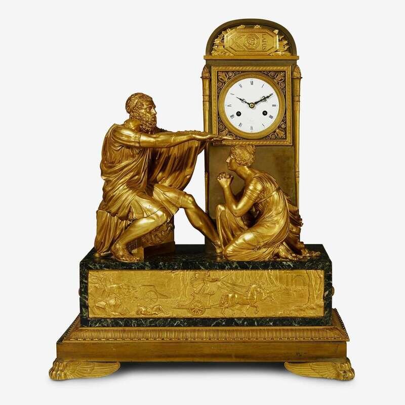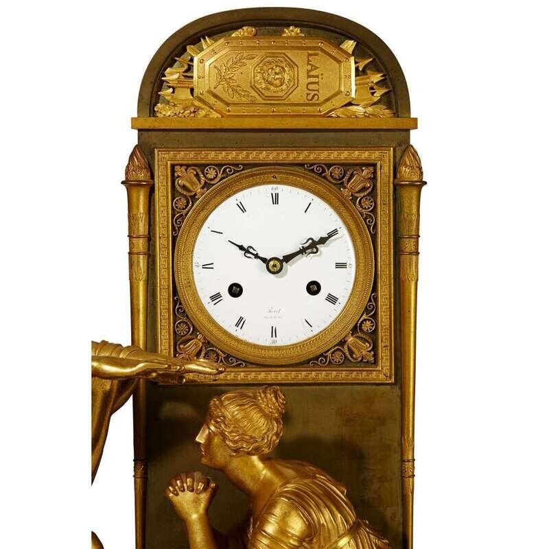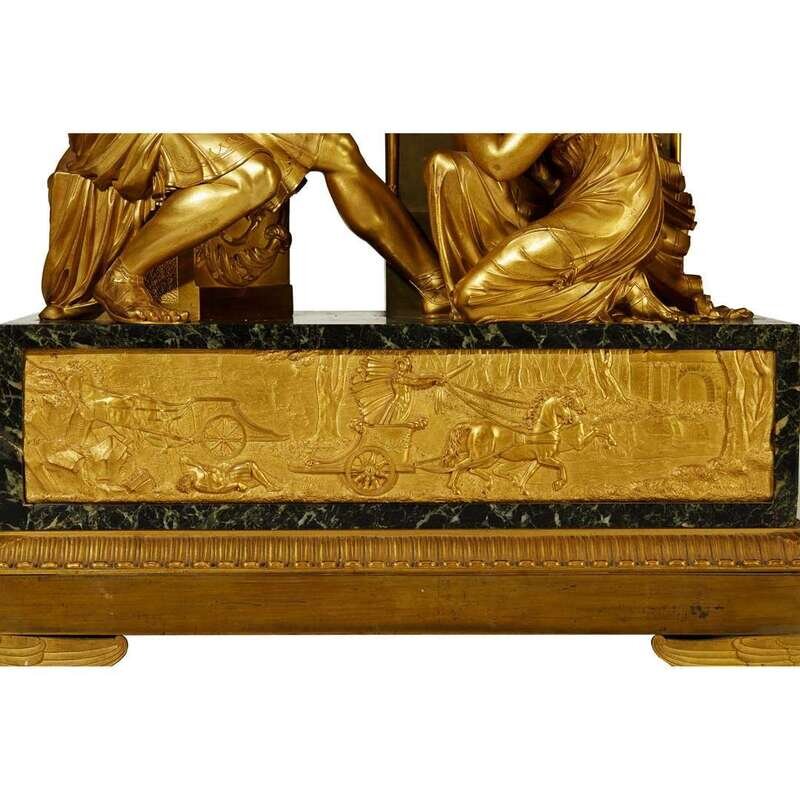 Depicting Antigone promising loyalty to Oedipus, the stele shaped case modeled as the tomb of King Laïus housing an enamel dial marked "Revel/Rue de la Loi" and later clock movement; the verde antico marble plinth mounted with an extremely fine relief frieze depicting Oedipus' murder of Laïus; the whole raised on an acanthus-cast bronze base above gryphon feet.