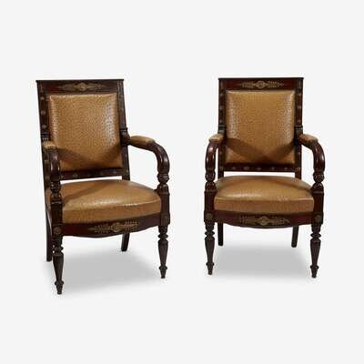 A pair of Napoleon III style gilt bronze mounted and faux ostrich leather upholstered mahogany fauteuils à la reine late 19th century
