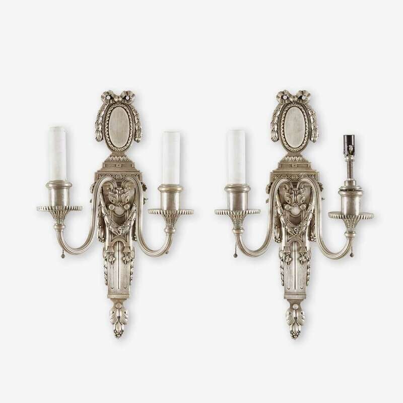 A pair of classical style silvered bronze two-light sconces E. F. Caldwell & Co., New York, NY, early 20th century