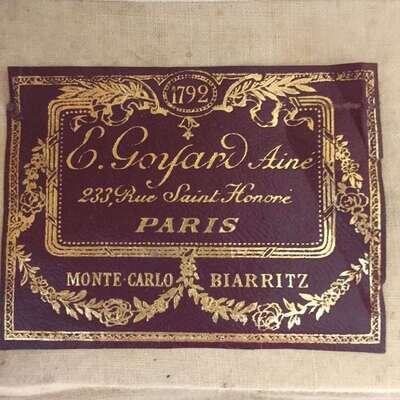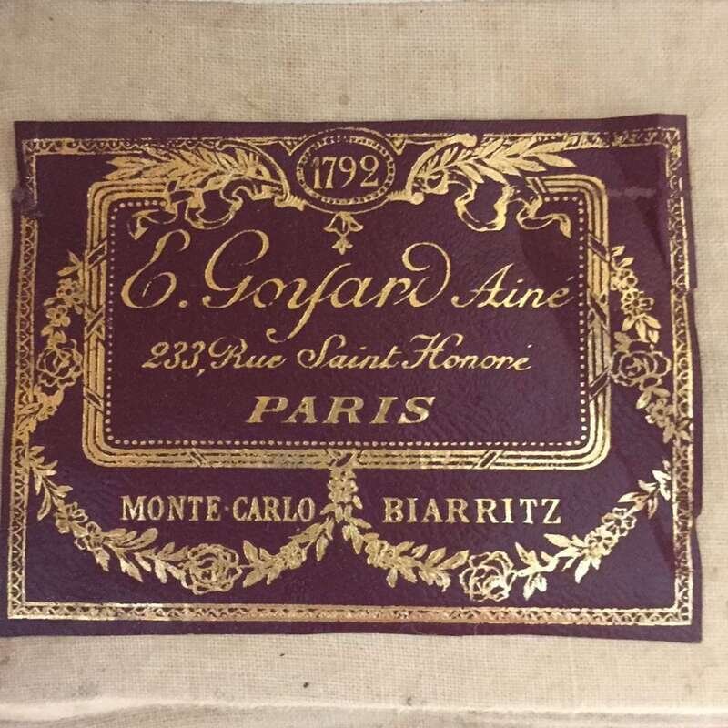 The side mounted with original Malles Goyard metal label, the interior with red and gilt paper label "E. Goyard Aine/233, Rue Saint Honore/Paris/MONTE-CARLO/BIARRITZ", and the underside stamped twice "MALLES GOYARD/233 RUE SAINT HONORE, PARIS"; with applied travel stickers and monogrammed.