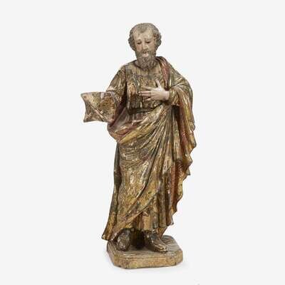 A Continental gessoed gilt and polychrome decorated carved wood figure of a saint probably Bohemia, last quarter 18th century