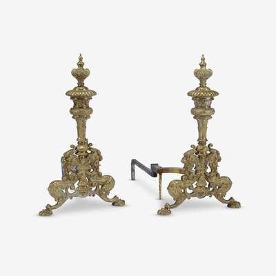A pair of Italian Renaissance Revival brass and iron dragon-form andirons 19th century