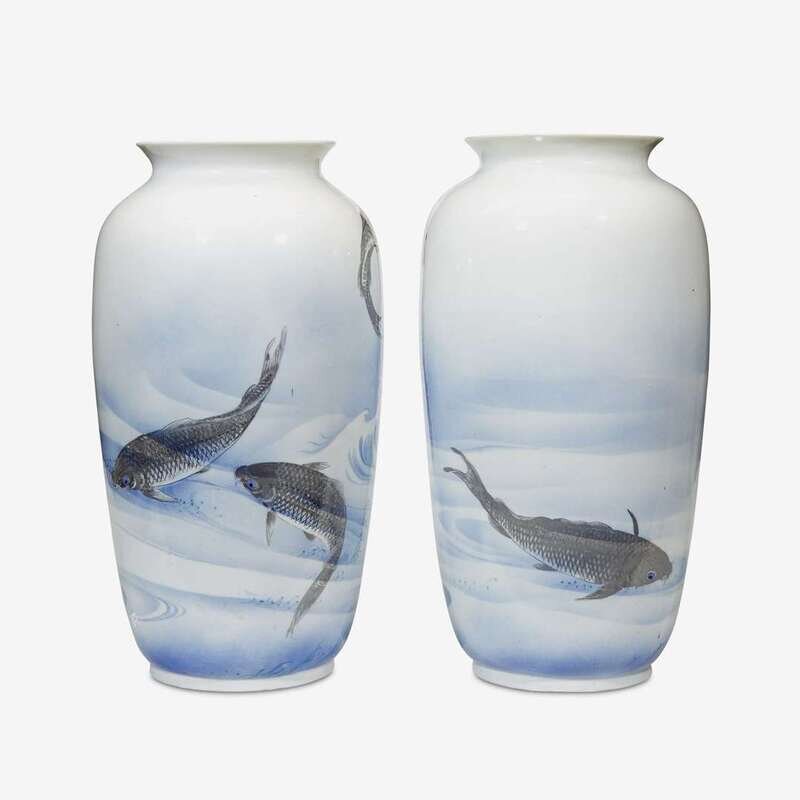 Each of tapering form with wide mouth, finely glaze-decorated in a blue and grey palette depicting carp fish amongst ocean waves; each with blue underglaze mark to underside. (2).