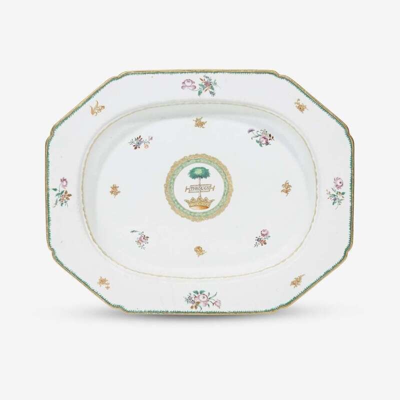 Of octagonal form, centered by an heraldic crest for the Hamilton family of Scotland, the well and rim finely decorated with gilt floral sprays.