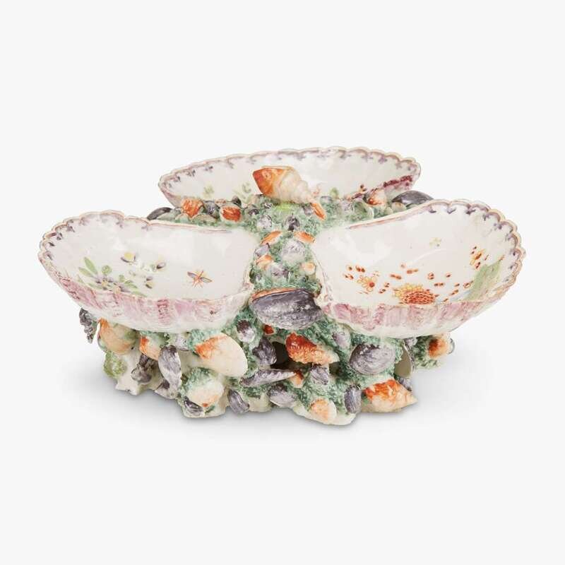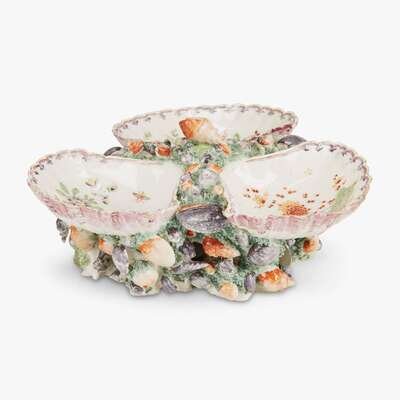 Each in the form of three up-turned shell dishes centered by a cluster of shells and seaweed, raised on an openwork base applied with naturalistic shells and seaweed. (2).