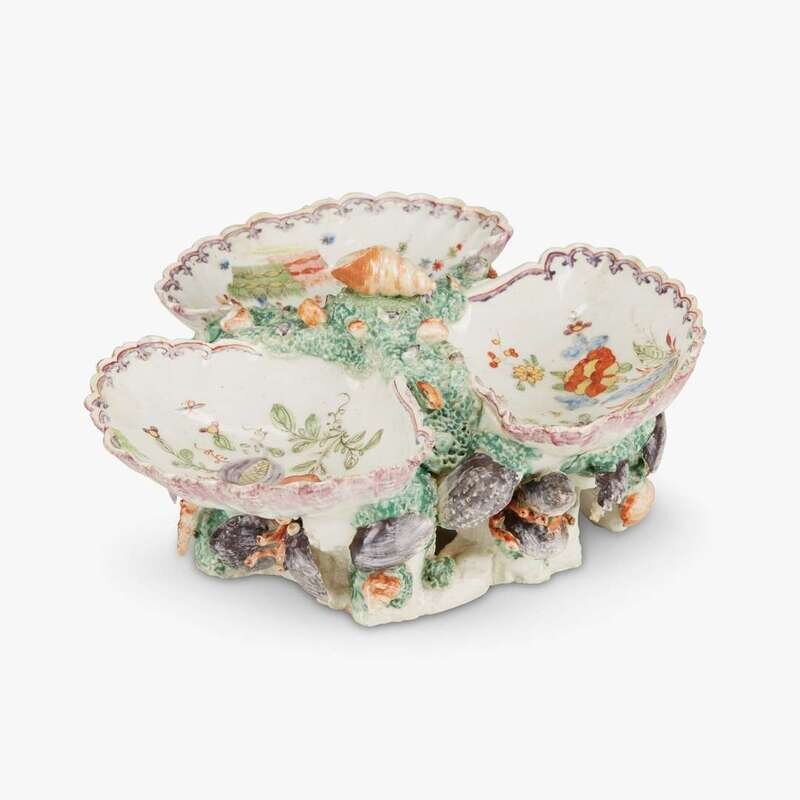 A pair of Bow soft paste porcelain triform sweetmeat dishes circa 1754-56