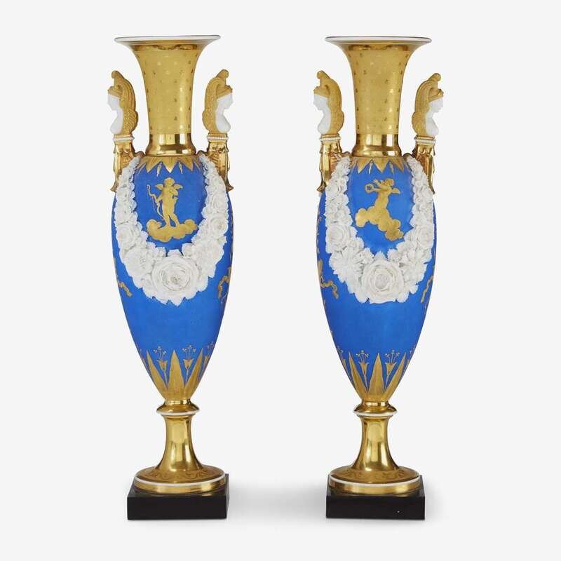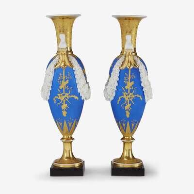 Of inverted ovoid form with parcel-gilt neck and Sphinx-form handles, the blue painted body mounted with applied moulded porcelain garlands and decorated with parcel-gilt classical motifs; raised on turned parcel-gilt socle on square base. (2).