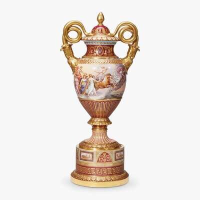 Meissen style, surmounted by a domed cover and flanked by gilt handles, the ovoid body finely painted with a continuous scene depicting Aurora to one side and Cupid and the Three Graces to the other, signed "Wagner"; the fluted lower section with gilt decoration against a maroon ground, raised on fluted socle with flared collar and circular foot mounted to conforming pedestal base; stamped and numbered to underside and bearing inscriptions "Germany/Amor und Grazien" and "Aurora".