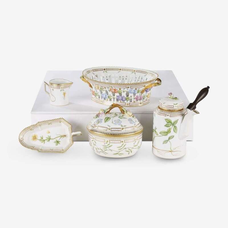 Comprising a coffee pot, covered sugar, creamer, reticulated fruit basket, and pickle dish. (5).